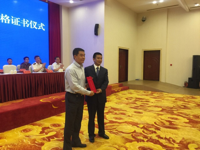 聯(lián)合驗(yàn)收組組長、海關(guān)總署加貿(mào)司李志輝副司長向昆明綜合保稅區(qū)管委會專職副主任張宏頒發(fā)合格證書